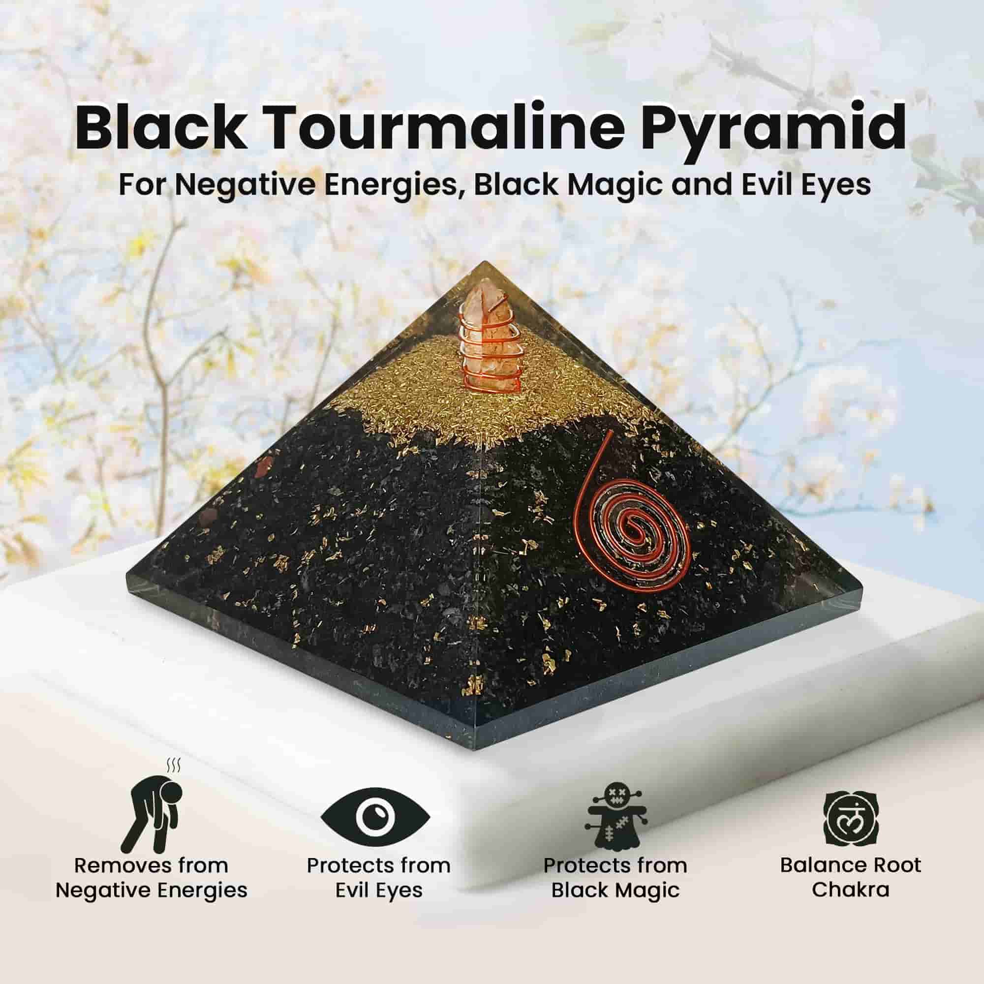 Black Tourmaline Orgonite Pyramid is a protecting and healing stone pyramid. This pyramid can be used by people who want to protect him or her from negative energies, Evil eyes, Psychic attacks, and black magic. This pyramid can be used by everyone like students, entrepreneurs, homemakers, service persons, and others to reduce their fear and raise their confidence to make their lives better. Black Tourmaline is the birthstone for people having Libra, Taurus, Scorpio and Capricorn zodiac signs but this pyramid can be used by anyone irrespective of their zodiac sign.