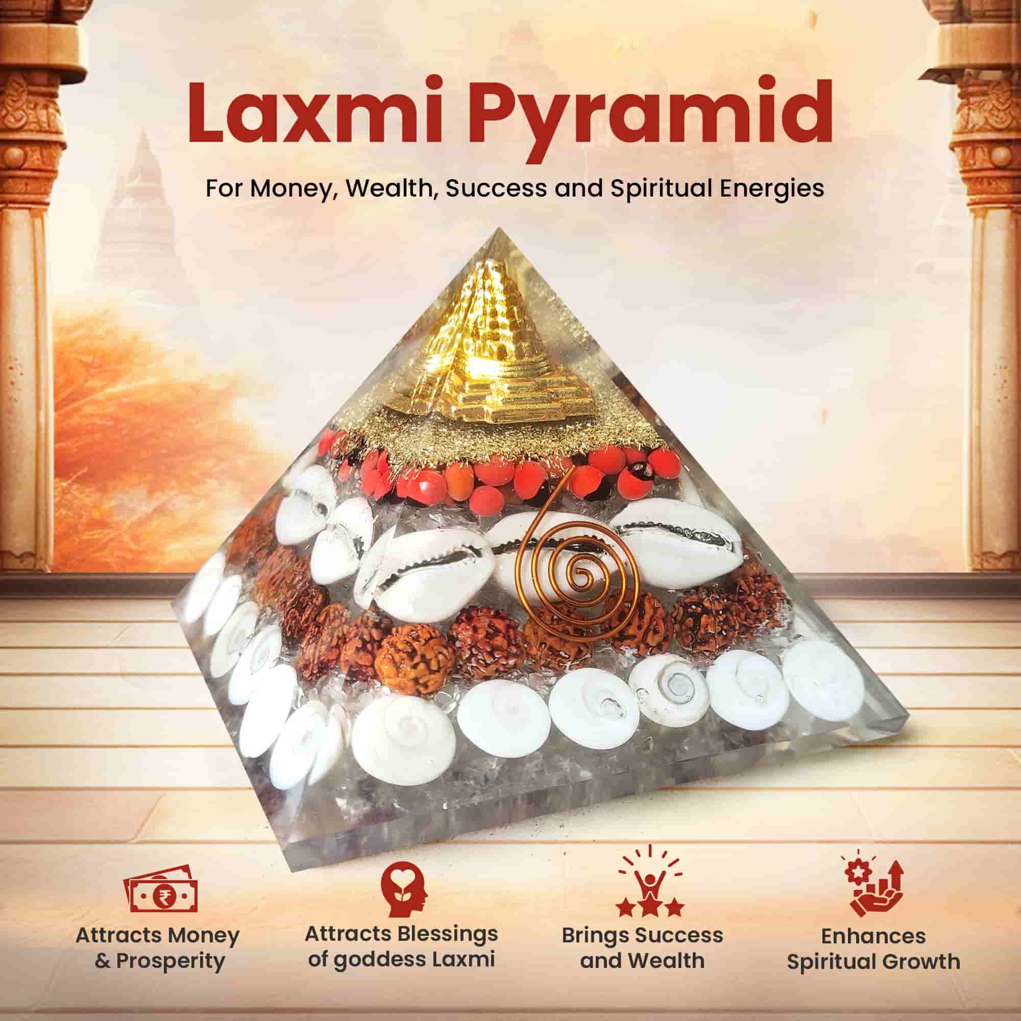 The orgone pyramid naturally has amplifying energy or universal energy. The energy of the pyramid when combined with auspicious elements like Gomati Chakra, Rudraksha beads, Shree Yantra, White Kauri, Ratti Seeds, Dai ko Myo symbol, copper dust and clear quartz chips the amplifying energy of the orgone pyramid becomes more powerful and start benefitting even more effectively.