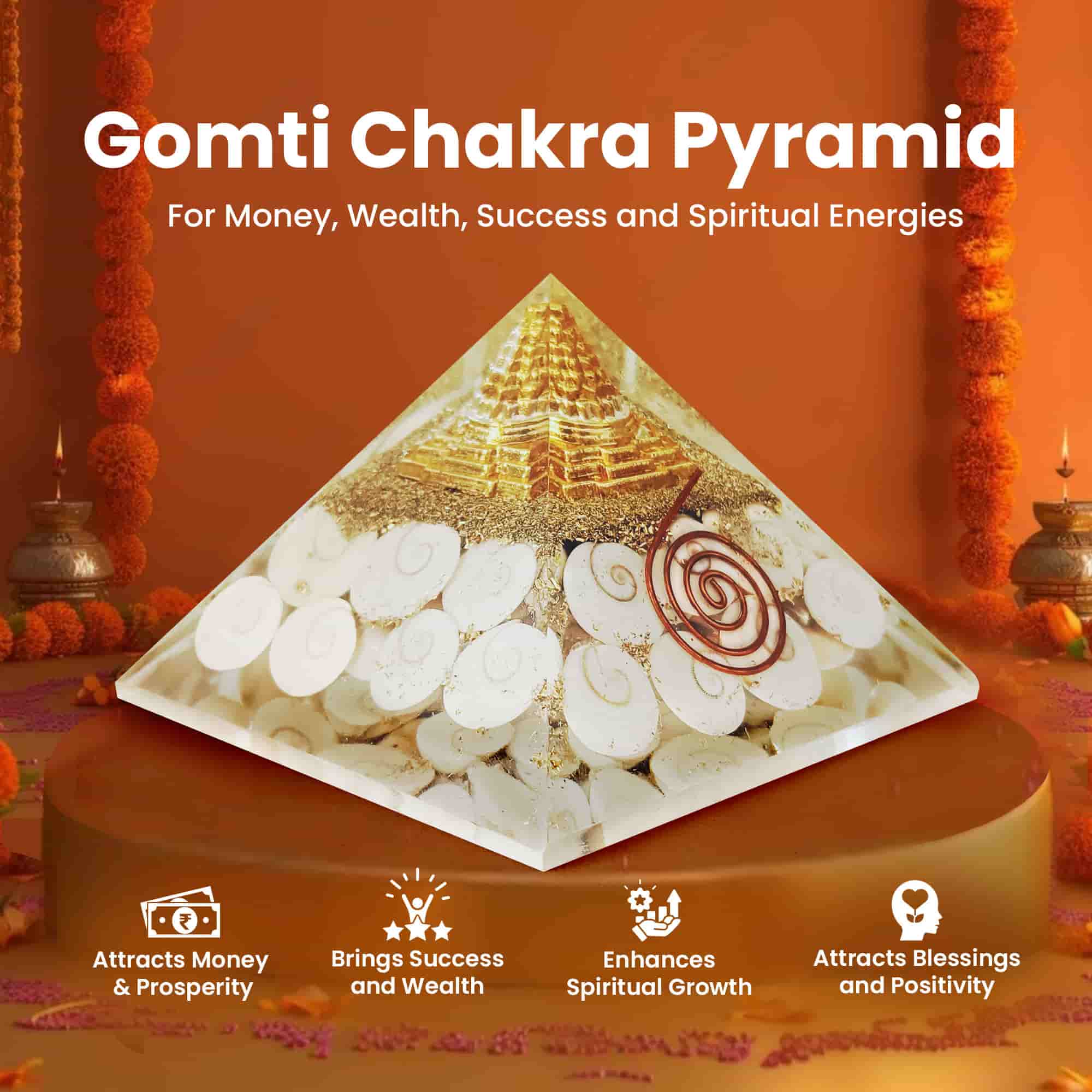 Gomti Chakra Orgonite Pyramid is a beautiful pyramid that is used for its spiritual and physical benefits. This pyramid helps in attracting prosperity, wealth, success, and good luck. The Gomati chakra pyramid is prepared using a few auspicious elements like Gomti Chakras, Shri yantra, Dai ko Myo symbol, and Copper Dust. These elements increase the spiritual value of the Gomti Chakra pyramid. This pyramid also protects the user from all types of evil effects. The Gomti Chakra pyramid is also called ‘Nag chakra’ as it is believed that the Gomti chakra pyramid is beneficial for the people who have 'Naag dosh' or 'Sarpa Dosha' in their horoscope. This Pyramid is blessed by Goddess Lakshmi and it is believed that people who use Gomti Chakra Pyramid will be blessed with money, good health, and prosperity.
