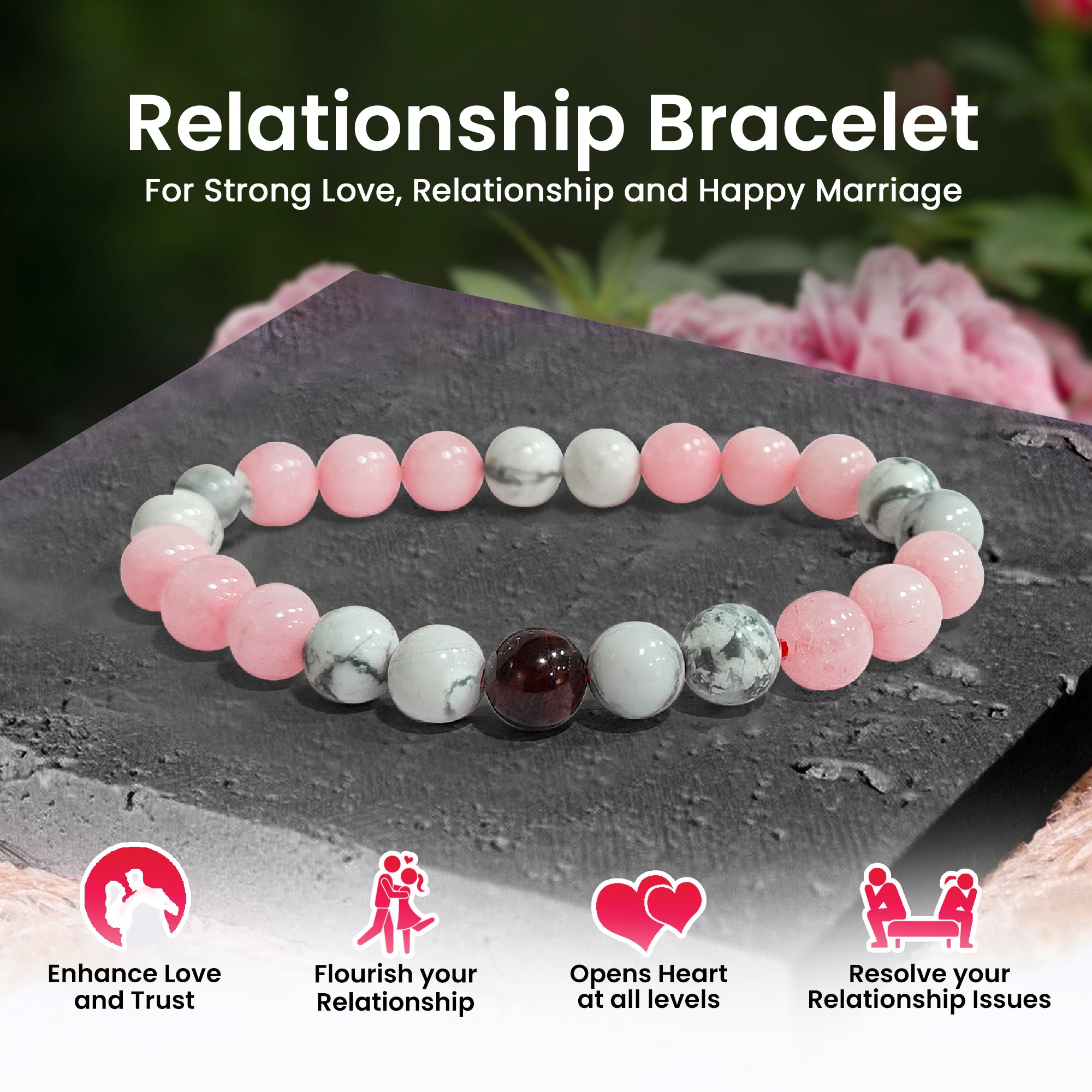 The relationship bracelet is used to enhance love, trust, and emotional healing in any relationship. This special relationship bracelet is prepared using a beautiful combination of Rose Quartz, Garnet, and Howlite crystals. Each crystal in this relationship bracelet is chosen for its unique and meaningful properties. Rose quartz which is a love stone, is used to promote compassion and emotional healing to strengthen connections. Garnet, in its deep red colour, inspires passion, loyalty, and commitment, adding energy to the bracelet. Howlite, with its calming properties, helps balance the bracelet by promoting patience and understanding in relationships.