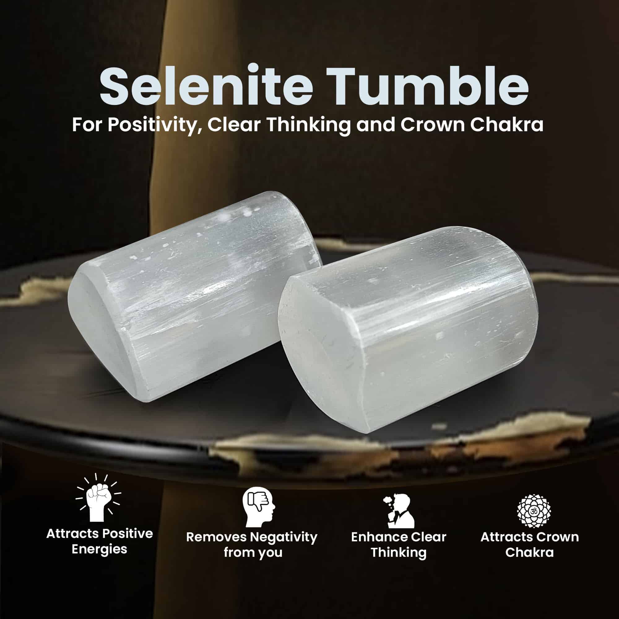 Selenite tumble refers to a small, translucent, and polished piece of selenite crystal tumble. Selenite tumble naturally has cleansing and purifying properties so it can also amplify other crystals’ energy as well. Selenite is closely associated with the crown chakra, which is located at the top of the head. Selenite is believed to promote spiritual growth by balancing and opening the crown chakra. Selenite can cleanse and purify your home and working space by removing the negative energies away. It is often used to promote a sense of peace, positivity, and spirituality. Selenite tumbles help enhance your mental clarity, thinking ability, and decision-making skills as well.