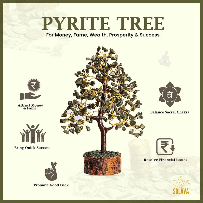 Usage of Pyrite Tree - This Money tree for home decor is used to attract Money and prosperity, Bring Success & Positivity, Resolve Financial Problems, Promote Good Luck and motivation, Boost Confidence and willpower, and Balance Sacral and solar Plexus Chakra.